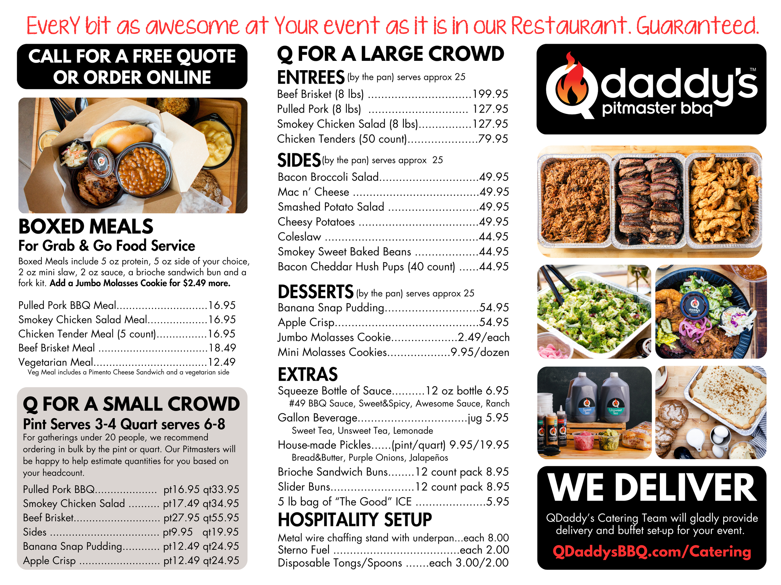QDaddy’s delivers to all of Hampton Roads for a delivery fee ranging between $30-$100. Fee is calculated based on milage. Let us quote you for delivery and set-up of your catering order.